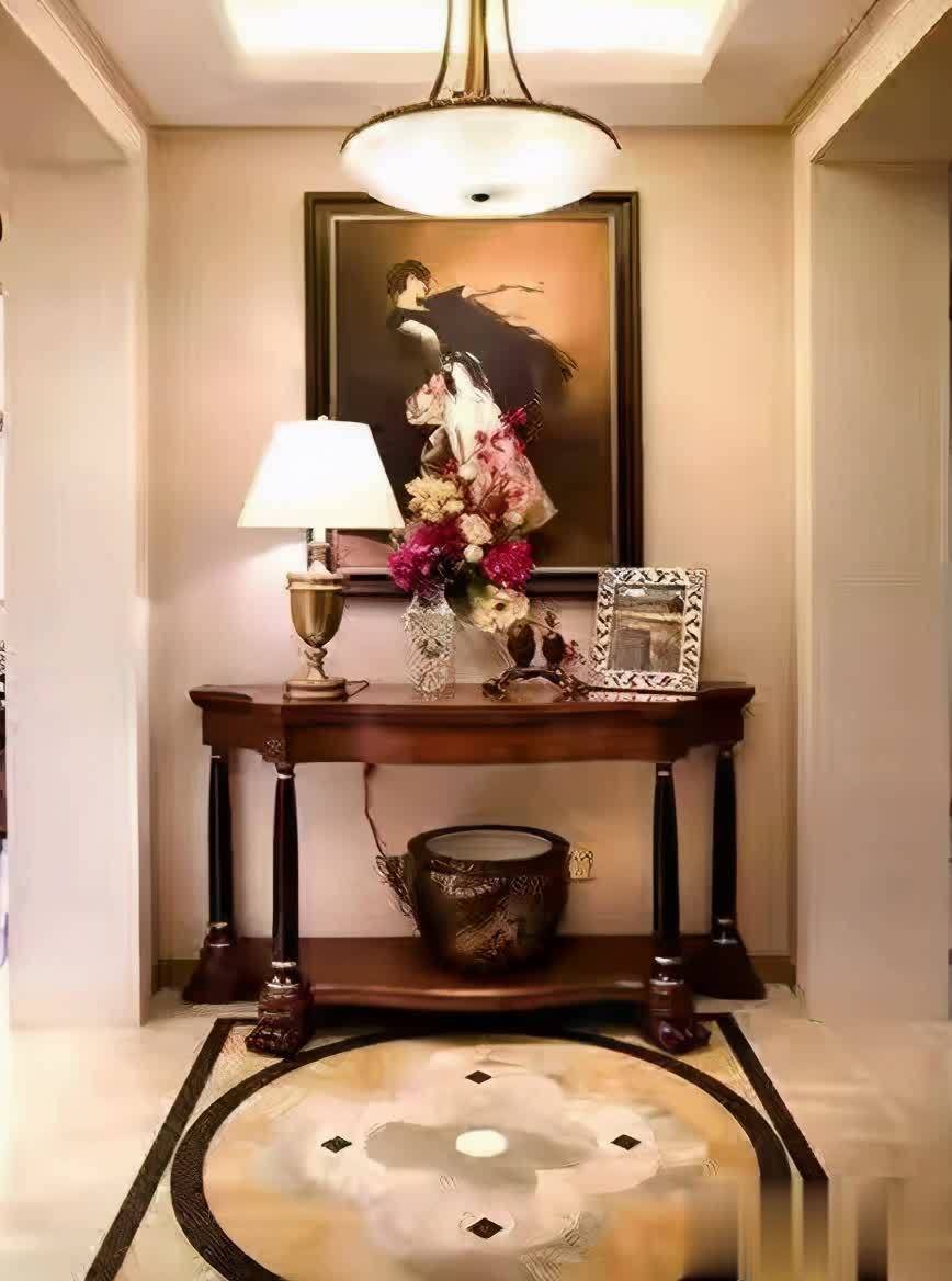 接下来我们看到的是陈道明家中的玄关,玄关整体看上去与家中别处空间有些不同相对还比较现代风格,墙面上悬挂着一副艺术画很是精致大气,吊灯选择得不得不说非常有品味,玄关柜上摆放着照片与小摆件很是精致大气进门后看到此处给人第一感觉就是美好幸福。